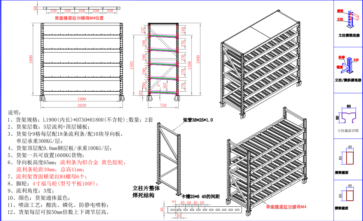 上圖是根據(jù)客戶要求貨架規(guī)格L1900*W750*H1800 不含腳輪 數(shù)量 5套 貨架層數(shù):5層流利+頂層鋪板 貨架每層配18條流利條,配10塊導(dǎo)向板 單層承重300KG/層貨架頂層配0.6mm鋼層板,承重100KG/層 貨架一共可放置1600KG貨物,導(dǎo)向板高度65mm 流利條為鋁合金,黃色膠輪 流利條輪距30mm 總高41mm 腳輪采用4寸福馬輪 流利條角度為3度 貨架每層可按50mm倍數(shù)上下調(diào)節(jié)層高.